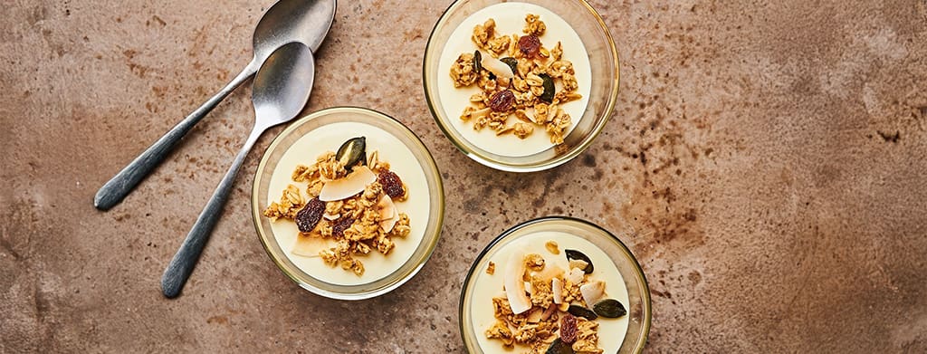 - Strooi het granola over de crème en zet de dessertjes in de koelkast om goed af te koelen en op te stijven.